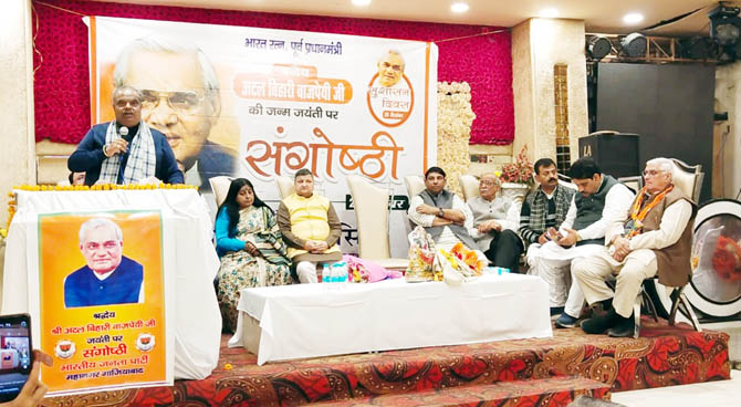 गाजियाबाद। पूर्व प्रधानमंत्री स्वर्गीय अटल बिहारी वाजपेयी की जयंती पर सोमवार को सुशासन दिवस पर महानगर में वसुंधरा स्थित पर्ल ग्रीन फार्म हाउस के सभागार में संगोष्ठी का आयोजन किया गया। जिसमें मुख्य अतिथि मुख्य वक्ता के रूप में जिला महानगर प्रभारी एमएलसी मानवेंद्र सिंह चौहान उपस्थित रहे। इनके साथ मंचासिन राज्यसभा सांसद अनिल अग्रवाल, दर्जा प्राप्त राज्य मंत्री कैप्टन विकास गुप्ता, बलदेव राज शर्मा, अशोक गोयल, विधायक सुनील शर्मा, पूर्व विधायक कृष्णवीर सिरोही, पूर्व महापौर आशा शर्मा, पूर्व विधायक रूप चौधरी उपस्थित रहे। सुशासन दिवस की संगोष्ठी की शुरुआत भारत रत्न स्व अटल बिहारी वाजपेयी के छायाचित्र पर माल्यार्पण कर, दीप प्रज्ज्वलन के साथ किया गया। सभी ने चित्र पर पुष्पांजलि कर अपने श्रद्धासुमन अर्पित किए।