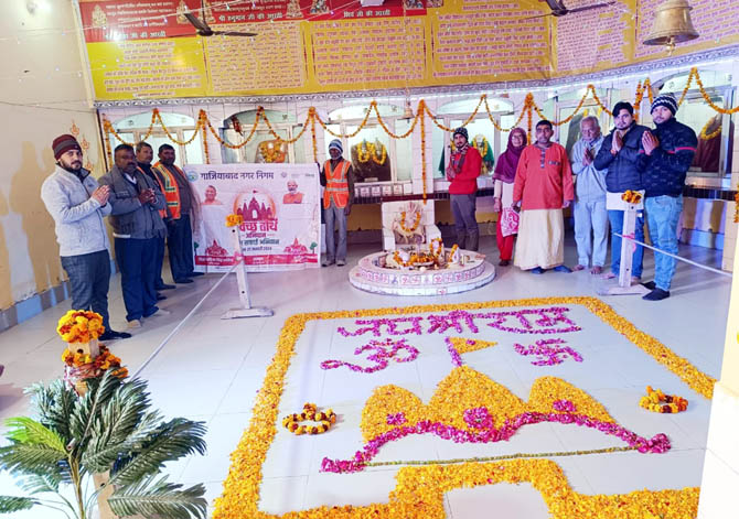 गाजियाबाद। अयोध्या के श्रीराम मंदिर में रामलला की प्राण-प्रतिष्ठा को लेकर शहर में उत्सव सा माहौल है। रामलला के स्वागत में गाजियाबाद शहर को अयोध्या सा सजाया जा रहा है। अयोध्या में आज सोमवार को भगवान श्रीराम प्राण प्रतिष्ठा कार्यक्रम के मद्देनजर रविवार को ही नगर निगम अधिकारियों ने शहर के मंदिरों से लेकर मांगों को पूरी तरह से सजा दिया। नगर आयुक्त विक्रमादित्य सिंह मलिक का कहना है कि शहर में दीपावली का माहौल है। शहर में 5100 दीप जलाने के साथ एलईडी स्क्रीन पर कार्यक्रम दिखाया जाएगा। वहीं शहर में रंग-बिरंगी लाइटें, झंडे आदि भव्य रूप से सजावट की गई है। नगर आयुक्त ने कहा कि 22 जनवरी का यह दिन ऐतिहासिक है। इसे भव्य बनाने के लिए निगम अधिकारी जुटे हुए हैं।