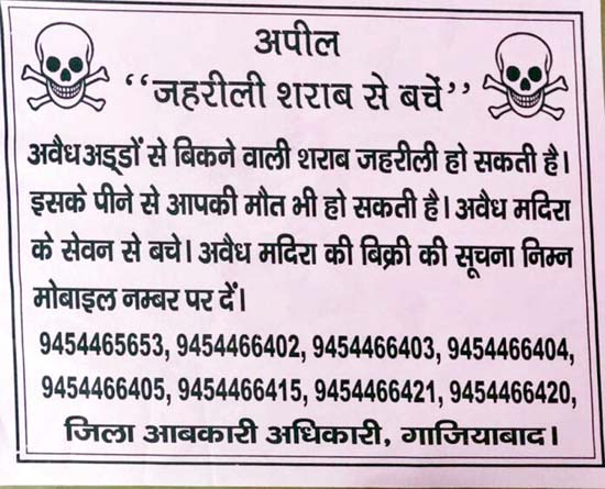 गाजियाबाद। जिला आबकारी विभाग की ओर से जागरूकता की मुहिम चलाई गई। मुहिम में विभिन्न जगहों में पोस्टर लगाकर व प्रचार अभियान चलाकर लोगों को अवैध शराब के खिलाफ जागरूक किया गया। शहरी व ग्रामीण क्षेत्र में भी इस प्रकार के पोस्टर लगाए गए है। अवैध शराब से अंधापन व अन्य बीमारियों का उल्लेख पोस्टर में किया गया है। शराब के अवैध कारोबारी भी अपने फायदे के लिए मनमाने तरीके से शराब को तैयार करते है। शराब तैयार करने के इस खेल में ये कारोबारी लोगों की जान की परवाह किये बगैर प्रतिबंधित सामग्री भी मिलाने से नहीं चूकते है। ऐसे में शराब का सेवन करने वाले लोग सस्ती और तेज नशे वाली शराब के चक्कर में अपने जीवन को दांव पर न लगाये। अवैध शराब के खिलाफ आबकारी विभाग कार्रवाई के साथ-साथ लोगों की जान बचाने के लिए जागरूकता अभियान चलाता रहता है।