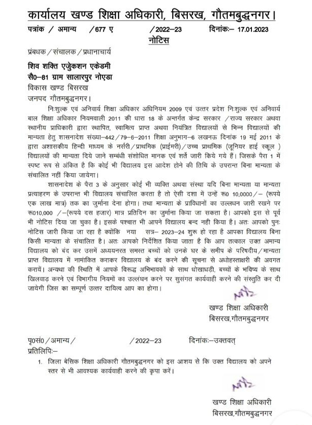 गौतमबुद्धनगर के शिक्षा विभाग ने सेक्टर-81 गांव सालारपुर नोएडा स्थित शिवशक्ति एजुकेशन एकेडमी को करीब डेढ माह पूर्व नोटिस जारी किया गया। पूर्व में इस स्कूल की बिसरख के खंड शिक्षा अधिकारी ने जांच की थी जिसमें स्कूल प्रशासन पर मान्यता सम्बंधी दस्तावेज नहीं पाए गए थे। इस स्थिति में यदि कोई स्कूल बिना मान्यता के संचालित होता है तो एक लाख रुपए जुर्माना और नियमों का उल्लंघन लगातार किए जाने पर दस हजार रुपए प्रतिदिन का जुर्माना निर्धारित किया जाता है। जांच के बाद विभाग द्वारा स्कूल को नोटिस जारी किया गया था, लेकिन उसके बाद भी एजुकेशन एकेडमी के संचालक बिना किसी डर के संचालन कर रहा हैं।