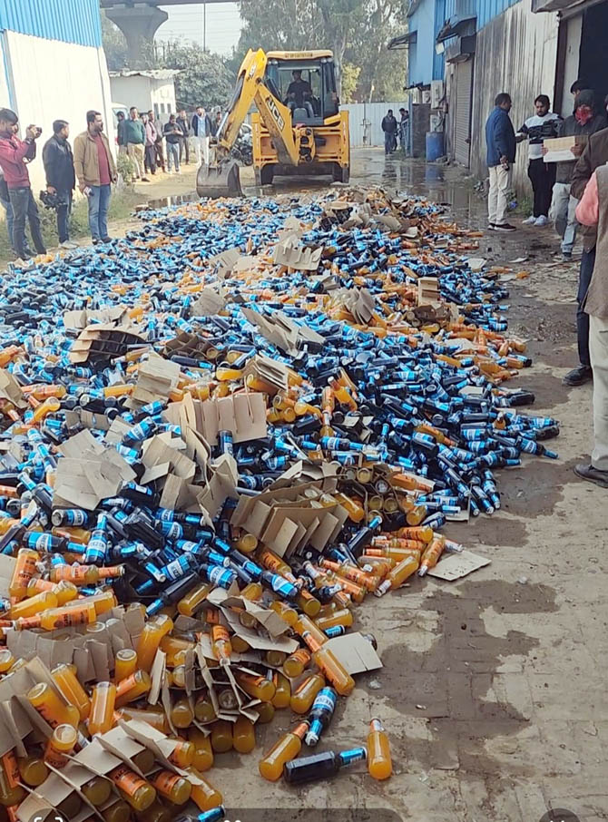 अलग धारिताओं के 103514 बोतल, मेसर्स बकार्डी इंडिया प्राइवेट लिमिटेड मोनाक की बकार्डी ब्लैक प्लेटिनम रम की 375 एमएल धारिता के 39 बोतल, बीडब्ल्यू एफएल-2ए. मेसर्स बकार्डी इंडिया प्राइवेट लिमिटेड मैसूर, बीडब्ल्यू एफएल-2 ए पर बकार्डी आरेंज रम, बकार्डी लेमन रम, एरोस्टोफ रेड वोडका, एरोस्टोफ ग्रीन वोडका, बकार्डी ड्रैगन बेरी रम, विलियम लासेंस स्कॉच की अलग-अलग धारिताओं के 19585 बोतल, मेसर्स बकार्डी इण्डिया प्राइवेट लिमिटेड काशीपुर, बीडब्ल्यू एफएल-2ए पर एरोस्टोफ वोडका, बकार्डी कार्टा, बकार्डी ब्लैक बकार्डी लेमन एंव बकार्डी एप्पल की अलग-अलग धारिताओं के 32192 बोतल, मेसर्स बकार्डी इंडिया प्राइवेट लिमिटेड मंसूरपुर व मेसर्स बकार्डी इण्डिया प्राइवेट लिमिटेड नासिक पर बकार्डी लेमन सुपर क्लासिक रम एंव लीगेसी प्रीमियम ब्लेंडेड व्हिस्की के दुर्घटनाग्रस्त नॉन स्कैनेबल अलग-अलग धारिताओं के 5323 बोतल, मेसर्स एसएनजे ब्रिवरीज प्राइवेट लिमिटेड बीडब्ल्यू एफएल-2बी पर दुर्घटनाग्रस्त नॉनस्कैनेबल अलग-अलग धारिताओं के 74472 कैन मेसर्स ग्रेनो 69 ब्रिवरीज प्राइवेट लिमिटेड बीडब्ल्यू एफएल-2 बी पर प्रूस्ट प्लैटिनम बीयर की 72 कैन का विनष्टीकरण वीडियोग्राफी करवाते हुए उसमें निहित एक्साइज ड्यूटी जमा करवाने के पश्चात कुल 7000 हजार बोतलों पर बुलडोजर चलाकर उसे नष्ट किया गया। नष्ट की गई शराब की कीमत करीब 8 करोड़ रुपए है। उन्होंने बताया दो वर्ष से कंपनी की वैधता समाप्त है। उक्त शराब का शराब तस्करी में दुरुपयोग न हो इसके चलते यह कार्रवाई की गई। स्टॉक को नष्ट करने के लिए आबकारी आयुक्त से परमिशन ली गई थी। परमिशन मिलने के बाद शराब को नष्ट कर दिया गया।