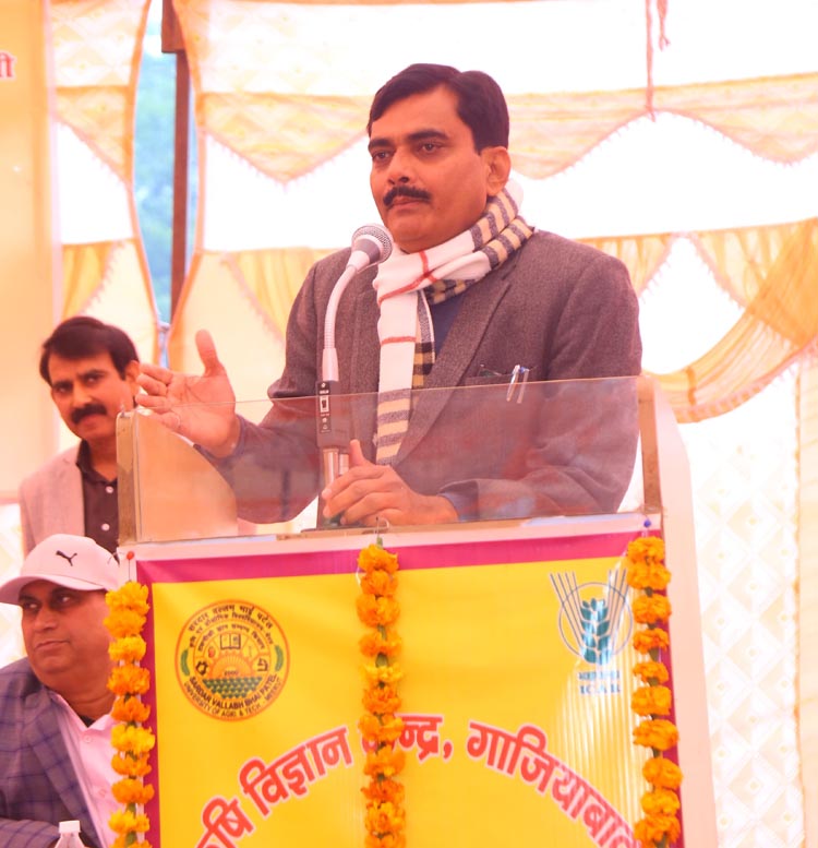 गाजियाबाद। किसान मसीहा एवं भारत रत्न पूर्व प्रधानमंत्री चौधरी चरण सिंह की 122वीं जयंती पर सोमवार को कृषि विज्ञान केंद्र मुरादनगर के प्रांगण में सब मिशन ऑन एग्रीकल्चर एक्सटेंशन योजना के तहत किसान सम्मान दिवस एवं किसान मेले का आयोजन किया गया। जिलाधिकारी इन्द्र विक्रम सिंह ने किसानों को संबोधित करते हुए कहा कि पूर्व प्रधानमंत्री चौधरी चरण सिंह के आदर्शों पर चलकर किसान उद्यमिता की ओर अग्रसर हो सकता है। सरकार की मंशा के अनुरूप उत्तर प्रदेश की अर्थव्यवस्था एक ट्रिलियन करने के लिए कृषि का महत्वपूर्ण योगदान हो सकता है। इसके लिए किसानों को कृषि विवधिकरण जिसमें कृषि की फसलों के साथ साथ पशुपालन मत्स्य पालन औद्यानिकी को सम्मिलित करते हुए खेती की जाए। उत्पादित उपज या फसल की मार्केटिंग खाद्य प्रंशसकरण करते हुए किसान उत्पादक संगठन के माध्यम से कृषि जिन्स,उत्पाद का मूल्यवर्धन कर किसान से सीधे उपभोक्ता तक पहुंचाया जा सकता हैं। कार्यक्रम में 600 किसान उपस्थित हुए।