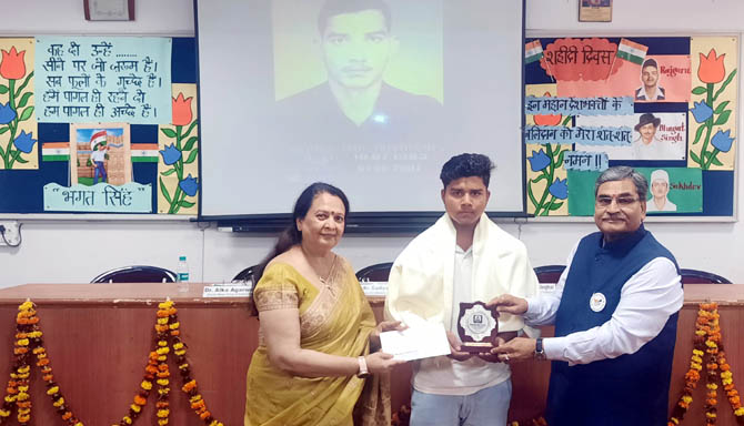 मेवाड़ ग्रुप ऑफ इंस्टीट्यूशंस की ओर से शहीद दिवस के मौके पर शहीद ब्रह्मपाल सिंह मेरठ की पत्नी संगीता और शहीद यशपाल सिंह धौलाना के पुत्र पुष्पेन्द्र को शॉल, स्मृति चिह्न व नकद राशि भेंट कर सम्मानित किया। इंस्टीट्यूशंस के छात्र-छात्राओं प्रियंका, आश्ना, रोशन, श्रेया, सफूरा, नंदिनी, खुशी वर्मा, यशिका आदि ने कविता, सम्भाषण, गीत और आकर्षक स्लागनों के जरिये पूरे माहौल को देशभक्तिमय बना दिया। इस अवसर पर मेवाड़ ग्रुप ऑफ इंस्टीट्यूशंस का तमाम शिक्षण स्टाफ व विद्यार्थी मौजूद थे। कार्यक्रम का सफल संचालन दीपिका मंडोला ने किया।