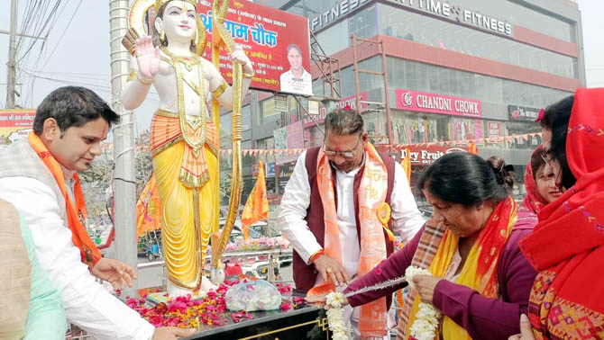 गाजियाबाद। अयोध्या में श्री राम की प्राण प्रतिष्ठा के आयोजन के चलते पूरे देश में श्री राम की जय जयकार हो रही है। कहीं श्री राम जी की प्रतिमा तो कही चौराहे एवं सड़को के नामकरण किए जा रहे है। इसी प्रकार नगर निगम क्षेत्र सीमा के वार्ड 57 मकनपुर गांव के बाहर सोमवार को 5 फिट की प्रतिमा का अनावरण एवं श्री राम चौक का उद्घाटन महापौर सुनीता दयाल द्वारा किया गया। इस दौरान पार्षद राधेश्याम त्यागी, पार्षद अनुज त्यागी, पार्षद डॉ अनिल कुमार तोमर मुख्य रूप से उपस्थित रहे। महापौर ने बताया कि शहर के सभी वार्डो, हर कोने में श्री राम की जय जयकार हो रही है। श्री राम की प्रतिमा का अनावरण, यात्रा, सुन्दरकाण्ड पाठ, रामायण पाठ सभी शहरवासी श्री राम के गुणगान कर रहे है।