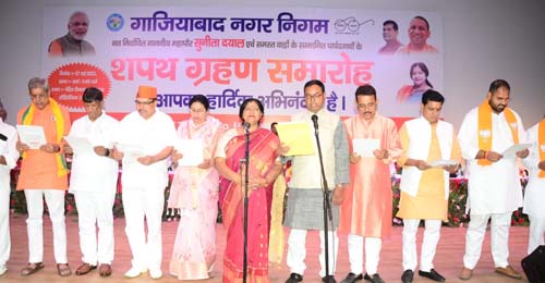 गाजियाबाद। आखिर नगर निकाय चुनाव में प्रचंड मतों से जीत दर्ज करने वाली नगर निगम की नवनिर्वाचित महापौर सुनीता दयाल ने शनिवार शाम को भगवामय माहौल में वंदे मातरम गान के बाद पद एवं गोपनीयता की शपथ ग्रहण की। नेहरू नगर स्थित नगर निगम के पंडित दीनदयाल ऑडिटोरियम में आयोजित शपथ ग्रहण समारोह में मेरठ मंडल की मंडलायुक्त सेल्वा कुमारी जे. पहुंची। मंडलायुक्त सेल्वा कुमारी जे.ने ऑडिटोरियम में ठीक 4.52बजे महापौर सुनीता दयाल को पद एवं गोपनीयता की शपथ ग्रहण कराई। महापौर सुनीता दयाल ने 2.87 हजार मतों से प्रचंड जीत हासिल की थी। महापौर के शपथ लेने के बाद महापौर सुनीता दयाल ने 100 पार्षदों को 15-15 पार्षदों को स्टेज पर बुलाकर शपथ ग्रहण कराई। शपथ ग्रहण करने से पहले वंदे मातरम गान किया गया।