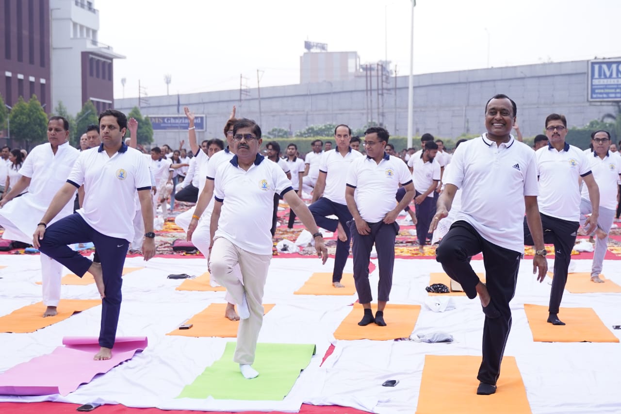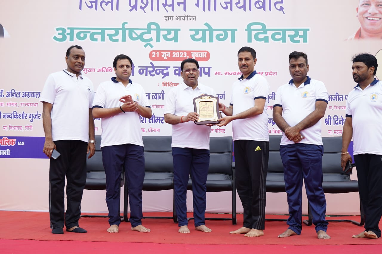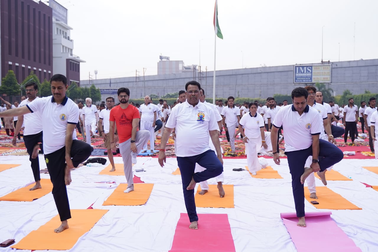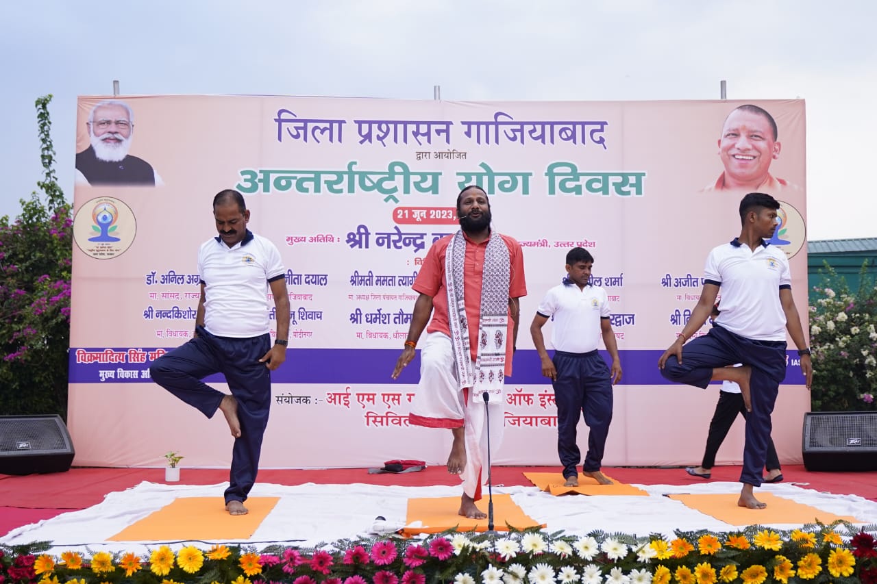 जिला प्रशासन एवं आयुष विभाग के संयुक्त तत्वावधान में आईएमएस यूनिवर्सिटी कैंपस डासना में आयोजित कार्यक्रम का शुभारंभ राज्यमंत्री नरेंद्र कश्यप, डीएम, सीडीओ ने संयुक्त रुप से दीप प्रज्वलित कर किया। जिसके बाद संयुक्त राष्ट्र से प्रधानमंत्री नरेंद्र मोदी के कार्यक्रम का संजीव प्रसारण देखा व सुना गया। यह एक ऐसा मौका था, जब जनप्रतिनिधि, जनपद भर के अधिकारी और आम नागरिकों ने एक साथ योगाभ्यास किया। इसमें राष्ट्रीय अध्यक्ष राष्ट्रीय योग भारती आचार्य यश पाराशर व उनकी टीम द्वारा योगासन कराए गए जिसमें कॉमन योग प्रोटोकॉल के तहत ग्रीवा शक्ति, घुटना शक्ति, विकासक क्रियाओं, ताड़ासन, वृक्षासन, पादहस्तासन, अर्ध चक्रासन, भद्रासन, वज्रासन, उष्ट्रासन, उत्थान, मंडूकासन, मकरासन, भुजंगासन, शलभासन, सेतुबंधासन, उत्तानपादासन, अर्ध हलासन, पवनमुक्तासन एवं सर्वासन सहित कपालभाति, नाड़ी शोधन, प्राणायाम, शीतली प्राणायाम, भ्रामरी प्राणायाम और ध्यान का अभ्यास कराते हुए प्रतिदिन योगाभ्यास का संकल्प दिलाया। राष्ट्रीय अध्यक्ष राष्ट्रीय योग भारती आचार्यश्री यश पाराशर की देखरेख एवं दिशा निर्देशन में योग प्रशिक्षकों ने इन योगासन और प्राणायाम का अभ्यास उपस्थित साधकों को कराया।