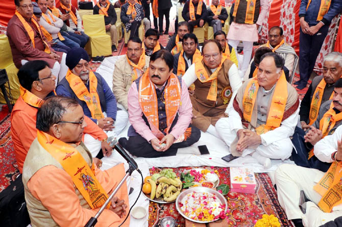 गाजियाबाद। अखिल भारतीय औद्योगिक एवं व्यापार महासभा द्वारा सोमवार को अंबेडकर रोड स्थित निकट बनवारी लाल रेस्टोरेंट पर प्राण प्रतिष्ठा यज्ञ का आयोजन किया गया। मुख्य अतिथि के रूप में पूर्व विधायक सुरेंद्र कुमार मुन्नी एवं संरक्षक चौधरी तेजपाल सिंह, संरक्षक अभिषेक गर्ग, राष्ट्रीय प्रवक्ता इंद्रजीत सिंह टीटू, पार्षद नीरज गोयल उपस्थित रहे। सभी व्यापारियों ने आहुति देकर राम नाम लिया। यज्ञ के बाद गायकों द्वारा राम भजनों का आनंद लिया गया। कार्यक्रम की अध्यक्षता राष्ट्रीय अध्यक्ष रविंद्र चौहान, संचालन राष्ट्रीय महासचिव विजय कुमार कौशिक ने किया। प्राण प्रतिष्ठा यज्ञ में मंत्र का उच्चारण पंडित शिवकुमार शर्मा द्वारा किया गया।