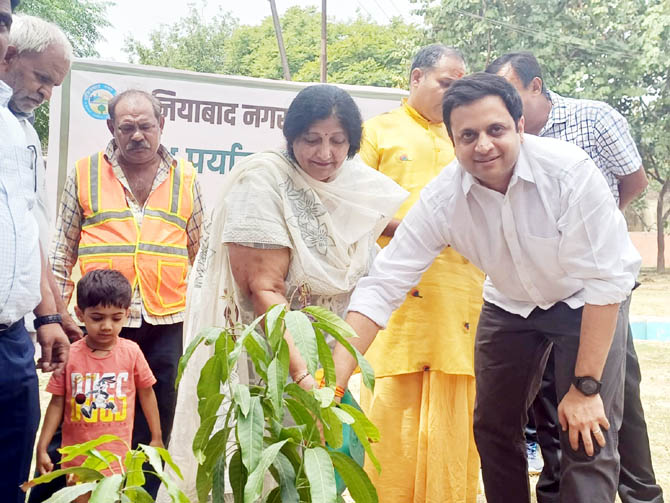 गाजियाबाद। विश्व पर्यावरण दिवस पर बुधवार को नगर निगम के उद्यान विभाग द्वारा शहर में वृक्षारोपण कार्यक्रम किया गया। महापौर सुनीता दयाल एवं नगर आयुक्त विक्रमादित्य सिंह मलिक ने संयुक्त रूप से पटेल नगर स्थित गीता संजय पार्क में 150 फलदार पौधे लगाकर वृक्षारोपण किया। ऐसे ही उपस्थित सभी लोगो ने भी एक एक पौधा लगाया। इस दौरान महापौर सुनीता दयाल ने बताया कि जिस प्रकार शहर में प्रदूषण बढ़ता जा रहा है और गर्मी का तापमान भी बढ़ रहा है ऐसे में शहर में सघन वृक्षारोपण किया जाना बहुत जरूरी है। अगर वृक्षारोपण नही किया गया तो प्रदूषण के साथ साथ तापमान भी बढऩे की संभावना है। पूरा विश्व पर्यावरण बदलाव के दौर से गुजर रहा है और हमें आने वाले भविष्य की चिंता करते हुए हर वर्ष पर्यावरण दिवस के अवसर पर एक पौधा जरूर लगाना चाहिए और उसकी देखभाल करनी चाहिए। हालांकि नगर निगम हर वर्ष मियावाकी के माध्यम से वृद्ध वृक्षारोपण कर रहा है। लेकिन शहर में अभी और वृक्ष लगाने की जरूरत है। हमारे द्वारा लगाए जाने वाले पौधे भविष्य में शहर के फेफड़ों के कार्य करेंगें।