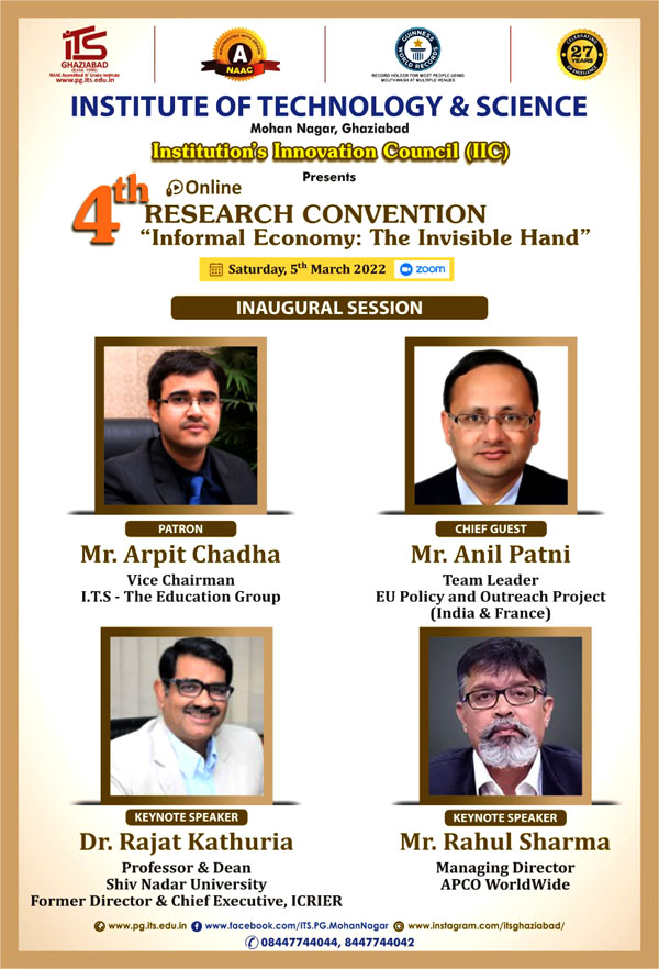 गाजियाबाद। मोहनगर स्थित आईटीएस संस्थान में आज यानि शनिवार को सुबह 10 बजे इनफॉर्मल इकोनोमी-द इनविजिबल हैंड विषय पर वर्चुअल रिसर्च कन्वेंशन का आयोजन किया जाएगा। जिसका उद्घाटन वर्चुअल रिसर्च कन्वेंशन का उद्घाटन मुख्य अतिथि मि अनिल पाटनी, टीम लीडर, इयू पॉलिसी एंड आउटरीच प्रोजेक्ट (इंडिया एंड फ्रांस), कीनोट स्पीकर मि राहुल शर्मा मैनेजिंग डायरेक्टर, एपीसीओ वल्र्डवाइड और डॉ रजत कथूरिआ, प्रोफेसर एंड डीन, शिव नादर यूनिवर्सिटी, फॉर्मर डायरेक्टर एंड चीफ एग्जीक्यूटिव, इंडियन कॉउन्सिल फॉर रिसर्च ऑन इंटरनेशनल इकोनोमिक रिलेशन्स एवं आईटीएस- द एजुकेशन ग्रुप के वाईस चेयरमैन अर्पित चड्ढा द्वारा किया जाएगा। रिसर्च कन्वेंशन दो पैनल डिस्कशन सत्रों में आयोजित किया जाएगा। जिसमे इंडस्ट्री, एकेडेमिया तथा सरकारी संस्थानों के वरिष्ठ एवं अनुभवी प्रतिनिधि ईआईएस एंड एमएसएमई, एग्रीकल्चर, हॉस्पिटैलिटी, फॉरेस्ट्री एंड अदर नेचुरल रिसोर्सेज, कंस्ट्रक्शन एंड रियल इस्टेट और सर्विस सेक्टर पर आधारित विषयों पर वर्तमान परिप्रेक्ष्य में चर्चा की जाएगी।