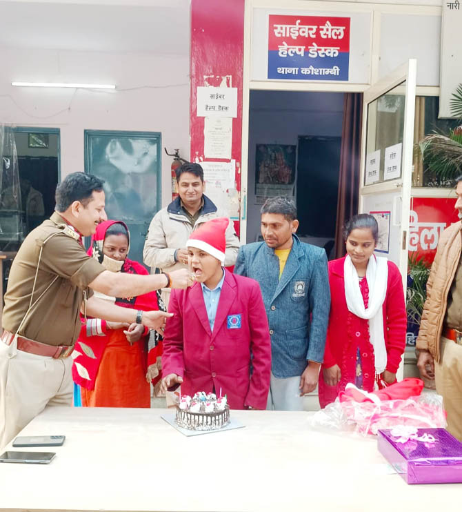 गाजियाबाद। थाना कौशांबी क्षेत्र में एक बच्चा घर से नाराज होकर बाहर निकल गया। परिजनों ने सोचा बच्चा कहीं आसपास होगा आ जाएगा। लेकिन बच्चा घर नहीं पहुंचा। तभी गश्त कर रही पुलिस की नजर उस बच्चे पर पड़ी। जब पुलिस ने बच्चे से रोने का कारण पूछा तो बच्चे ने बताया कि मम्मी पापा न मेरा जन्मदिन मनाते है और न ही मुझे सांता क्लॉज की ड्रेस दिलवाई। पुलिस पहले तो बच्चे की बात सुनकर हंसने लगी। फिर बच्चे के लिए सांता क्लॉज की ड्रेस मंगवाई और उसे बच्चे को पहनाकर उसका थाने में केक भी कटवाया।