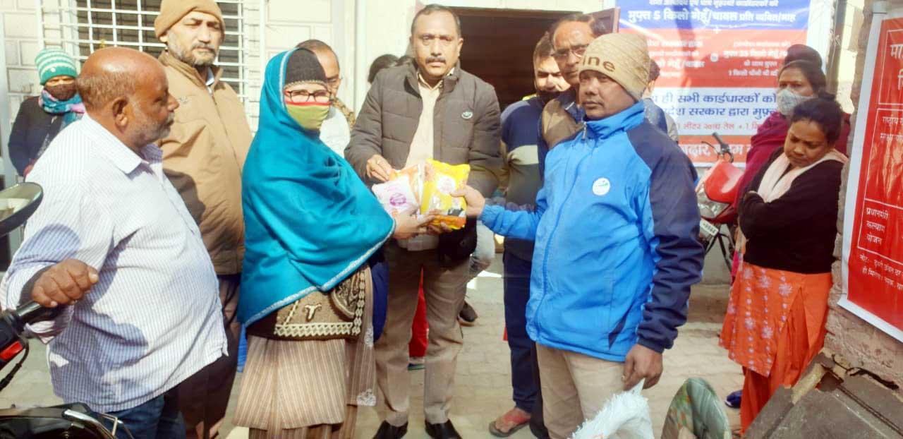 गाजियाबाद। गेहूं और चावल के साथ जिले में पहली बार नमक, तेल, दाल का भी राशन की सरकारी दुकानों पर निश्शुल्क वितरण किया गया। राशन वितरण का शुभारंभ क्षेत्रीय पार्षद मनोज गोयल ने किया। मनोज गोयल ने कार्ड धारकों को नमक, खाद्य तेल, दाल, गेहूं, चावल आदि का वितरण किया। उन्होंने कहा कि इसी तरह से मार्च 2022 तक राशन मिलता रहेगा। देश में अब तक का यह सबसे बड़ा राशन वितरण अभियान है। सरकार की योजना का सीधा लाभ अंत्योदय और पात्र घरेलू राशन कार्ड धारकों को मिल रहा है। गरीबों, मजदूरों और किसानों को बड़ा सहारा देने के लिए यह अभियान शुरू हुआ है। सेक्टर-1 वैशाली कामना स्थित राशन की दुकान पर 1 किलो दाल, 1 किलो तेल, 1 किलो नमक वितरण किया गया। प्रदेश के मुख्यमंत्री योगी आदिनाथ की सरकार द्वारा बांटा जा रहा है। इस मौके पर दुष्यंत गौतम, उमेश गोस्वामी, राजेश तिवारी, राकेश सहित क्षेत्र के अन्य निवासी उपस्थित है। लोगों ने देश के प्रधानमंत्री नरेंद्र मोदी और माननीय मुख्यमंत्री योगी आदित्य के समर्थन में नारे भी लगाए।