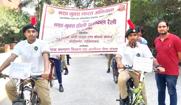गाजियाबाद। सामाजिक न्याय एवं अधिकारिता मंत्रालय, भारत सरकार के निर्देश पर समाज कल्याण विभाग, गाजियाबाद एवं भागीरथ सेवा संस्थान द्वारा चलाए जा रहे नशा मुक्त भारत अभियान के तहत डॉ. केएन मोदी साइंस एंड कॉमर्स कॉलेज प्रबंधन के सहयोग से बुधवार को मोदीनगर में नशा मुक्त साइकिल रैली का आयोजन किया गया। इसके अतिरिक्त नशामुक्त भारत अभियान के बारे में जानकारी देने के लिए कॉलेज सभागार में एक वर्कशॉप का भी आयोजन किया गया। नाश उन्मूलन में अपना सहयोग देने के लिए हस्ताक्षर अभियान चला बच्चों को शपथ भी दिलाई गयी। मुख्य अतिथि एसडीएम मोदीनगर शिवांगी शुक्ला ने हस्ताक्षर अभियान में हिस्सा लिया और जागरूकता साईकिल रैली को हरी झंडी दिखाकर रवाना किया।