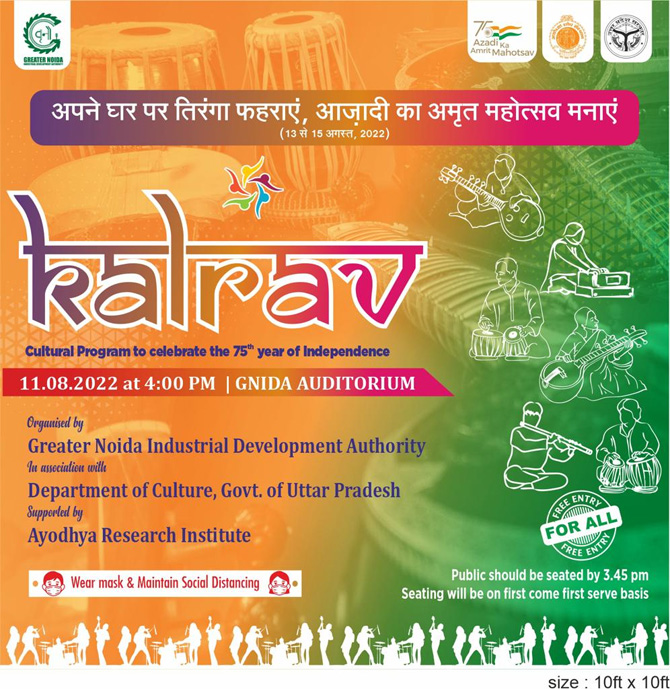 ग्रेटर नोएडा। ग्रेटर नोएडा प्राधिकरण व संस्कृति विभाग की तरफ से आयोजित होने वाले सांस्कृतिक कार्यक्रम कलरव का बृहस्पतिवार शाम चार बजे से ग्रेटर नोएडा प्राधिकरण के ऑडिटोरियम में लुत्फ उठा सकेंगे। आजादी का अमृत महोत्सव अभियान के अंतर्गत देशभक्ति थीम पर आधारित इस सांस्कृतिक कार्यक्रम में प्रसिद्ध लोक कलाकार अपनी मनमोहक प्रस्तुति देंगे। ग्रेटर नोएडा प्राधिकरण व संस्कृति विभाग उत्तर प्रदेश की संयुक्त पहल पर ग्रेटर नोएडा में कल्चरल प्रोग्रामों की श्रृंखला कलरव का आयोजन किया जा रहा है। इस बार देशभक्ति गीतों की थीम पर कलरव का आयोजन होगा।