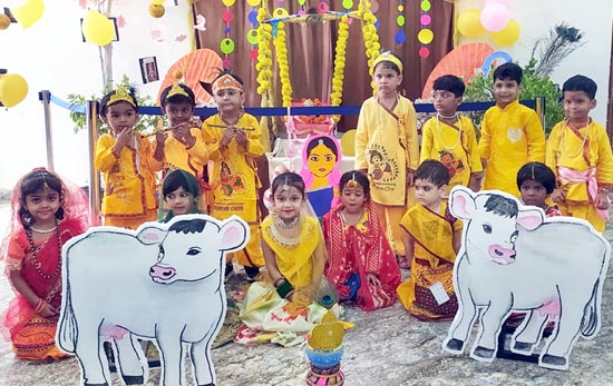 स्कूल में मुकुट पहने बच्चे और घाघरा चोली पहनी छोटी बच्चियों ने सबका ध्यान आकर्षित किया। उन्हें स्कूल प्रांगण में फूलों से बने विशेष झूले में बैठाकर झुलाया गया। छोटे बच्चों ने माखन चोरी का नाटक प्रस्तुत किया। इसी तरह जन्माष्टमी कार्यक्रम की शुरुआत राधा-कृष्ण के भजन से की गई। इसके बाद बाल गोपाल को झूला झूलाया गया। उन्हें मक्खन का भोग लगाया। बच्चों ने भगवान श्रीकृष्ण की लीलाओं का सुंदर वर्णन किया।