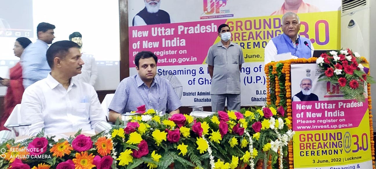 उन्होंने कहा कि वर्ष-2014 के बाद औद्योगिक विधि एवं निवेश को लेकर जो नीतियां बनीं।उसके तहत करीब 80 हजार करोड़ का निवेश हुआ है। जो नई शुरुआत की गई है।इससे उत्तर प्रदेश औद्योगिक क्षेत्र में एक नई ऊंचाइयों तक पहुंचेगा। इसी को लेकर आज लखनऊ में एक भव्य आयोजन किया गया है जहां की प्रधानमंत्री नरेंद्र मोदी शिरकत करने पहुंचे हैं। गाजियाबाद जिला अपने आप में एक औद्योगिक क्षेत्र है। जहां पर की औद्योगिक क्षेत्र में बहुत अधिक संभावनाएं हैं। जिलाधिकारी राकेश कुमार सिंह ने केंद्रीय राज्यमंत्री वीके सिंह का स्वागत करते हुए कार्यक्रम में उपस्थित सभी उद्यमियों को बधाई दी। उन्होंने जिले में अधिक से अधिक निवेश कर औद्योगिक इकाई स्थापित किए जाने का आहवान किया। उद्यमियों को प्रोत्साहित करते हुए केंद्र और प्रदेश सरकार द्वारा एमएसएमई को प्रदान किए जाने वाली सुविधाओं का लाभ उठाने के लिए प्रेरित किया। जिलाधिकारी द्वारा सभी उद्यमियों को अवगत कराया कि ग्राउंड बे्रकिंग सेरेमनी का मुख्य उद्देश्य जनपद एवं प्रदेश में निवेश को अधिक से अधिक बढ़ाना है जिससे जनपद एवं प्रदेश में सभी प्रकार के उत्पादों का निर्माण कर निर्यात को बढ़ावा मिले।