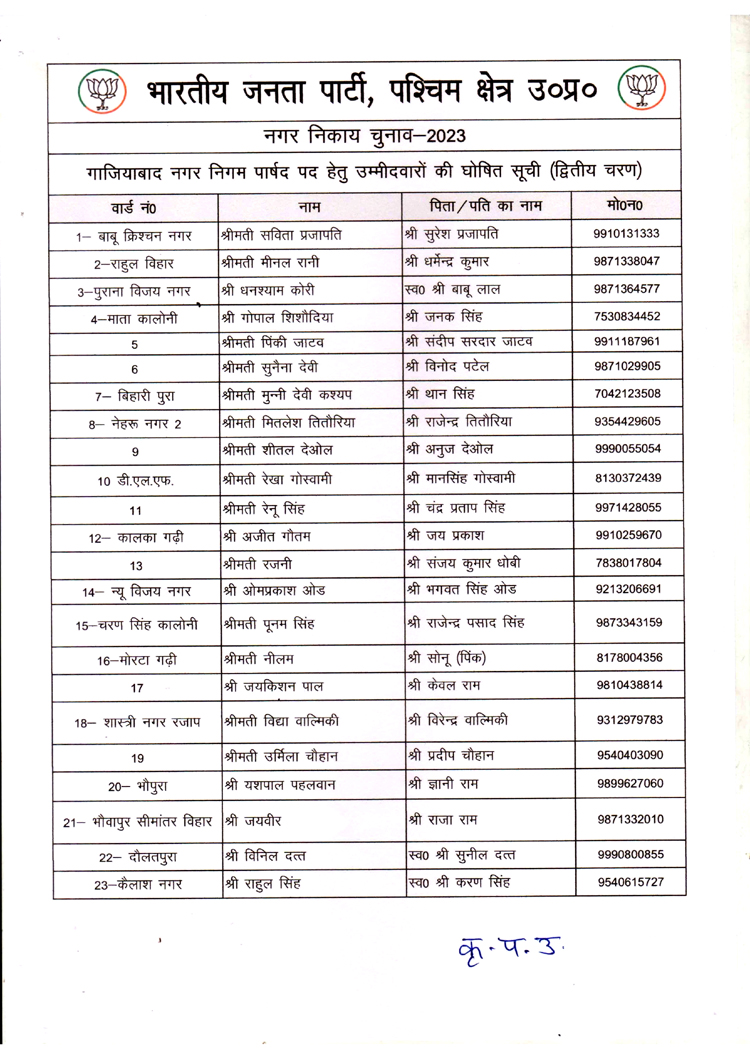 वहीं, वार्डों के पार्षदों के नामों की जारी की गई सूची के बाद वरिष्ठ पार्षद राजेंद्र त्यागी, हिमांशु मित्तल समेत कई दिग्गजों के टिकट काट दिए गए। भाजपा के प्रदेश उपाध्यक्ष चौधरी भूपेंद्र सिंह ने रविवार शाम को नगर निगम के सभी 100 वार्डों के पार्षदों की सूची जारी कर दी गई। टिकट की चाहत में पिछले काफी दिनों से कई दावेदार अपने-अपने राजनीतिक गुरूओं के चक्कर काट रहे थे। भाजपा की जारी की गई सूची में वार्ड-1 से सविता प्रजापति,वार्ड-2 मीनल रानी, वार्ड-3 घनश्याम कोरी, वार्ड-4 गोपाल शिशौदिया, वार्ड-5 पिंकी जाटव, वार्ड-6 सुनैना देवी, वार्ड-7मुन्नी देवी कश्यप, वार्ड-8 मितलेश तितौरिया, वार्ड -9 शीतल देओल, वार्ड-10 रेखा गोस्वामी, वार्ड-11 रेनू सिंह, वार्ड-12अजीत गौतम, वार्ड-13 रजनी, वार्ड-14 ओमप्रकाश ओड़, वार्ड-15 पूनम सिंह, वार्ड-16 नीलम, वार्ड-17 जयकिशन पाल, वार्ड-18 विद्या वाल्मीकि, वार्ड-19 उर्मिला चौहान, वार्ड-20 यशपाल पहलवान, वार्ड-21 जयवीर, वार्ड-22 विनिल दत्त, वार्ड- 23 राहुल सिंह, वार्ड-24 पवन कुमार गौतम, वार्ड-25 कन्हैया लाल, वार्ड-26 राज कुमार उर्फ राजू, वार्ड-27 सुनील जाटव, वार्ड-28 सुधीर कुमार, वार्ड-29 कुलदीप गुर्जर, वार्ड-30 रीना चौधरी, वार्ड-31 भूपेंद्र चौधरी, वार्ड-32 अजय प्रजापति, वार्ड-33 शरद शर्मा, वार्ड-34 आशा शर्मा,वार्ड-35 जोगेंद्र सिंह, वार्ड-36 प्रतिभा शर्मा, वार्ड-37 रवि भाटी, वार्ड-38 मनोज पाल, वार्ड-39 उदित मोहन, वार्ड-40 हिमांशु चौधरी, वार्ड-41 भूपेंद्र कुमार उपाध्याय, वार्ड-42 पूनम यादव,वार्ड-43 शीलत पाल,वार्ड-44 सिफाली,वार्ड-45 सुनदा सिंह, वार्ड-46 अजयवीर सिंह, वार्ड-47 अमित त्यागी, वार्ड-49 विरेंद्र त्यागी,वार्ड-50 अर्चना तेवतिया,वार्ड-51 सीमा यादव,वार्ड-52 अभिषेक चौधरी, वार्ड-53 सुमन, वार्ड-54 सतेंद्र पाल चौधरी, वार्ड-55 संतोष कुमार सिंह, वार्ड-56 मनोज त्यागी, वार्ड-57 सरदार सिंह रावत, वार्ड-58 देवनारायण शर्मा, वार्ड-59 राजीव शर्मा, वार्ड-61 शिल्पा चौधरी, वार्ड-62 मनु डबास, वार्ड-63 गुलशन, वार्ड-64 रूबी डागर, वार्ड-65 राजकुमार गुर्जर,वार्ड- 66 सचिन पांचाल,वार्ड-67 नीरज त्यागी, वार्ड-68 विनय चौधरी,वार्ड-69 कुलदीप त्यागी, वार्ड-70 रामनिवास बंसल,वार्ड-71 उमेश नागर, वार्ड-72 विमला देवी, वार्ड-73 आशीष बंसल, वार्ड-74 नरेश भाटी,वार्ड-75अनिल राणा,वार्ड-76 गौरव सोलंकी, वार्ड-77 नीलम भारद्वाज, वार्ड-78 ओमवती देवी,वार्ड-79 हरीश काडाकोटी,वार्ड-80 राहुल शर्मा,वार्ड-81 धीरज अग्रवाल,वार्ड-82 किरण राघव, वार्ड-83 कविता,वार्ड-84 प्रवीण चौधरी,वार्ड-85 प्रमोद राघव,वार्ड-86मदन राय, वार्ड-87 सिद्वी प्रधान अग्रवाल,वार्ड-88 नीरज गोयल,वार्ड-89राजकुमार सिंह, वार्ड-90 अनीश सैफी,वार्ड-91 शिवम शर्मा,वार्ड-92 शहला नदीम,वार्ड-93 मरजीना,वार्ड-94अनमोल खन्ना,वार्ड-95 सितारा,वार्ड-96 अनिल स्वामी,वार्ड-97 भगवाल अग्रवाल,वार्ड-98 डॉ.अनिल कुमार तोमर,वार्ड