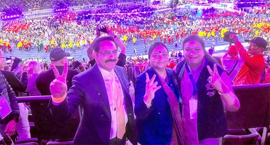 बर्लिन (जर्मनी) में हो रहे स्पेशल ओलंपिक 2023 के रंगारंग उद्घाटन समारोह में 17 जून शनिवार को डॉ पीएन अरोड़ा एवं डॉ उपासना अरोड़ा, डॉ मल्लिका नड्डा के साथ उपस्थित रहे। आसाम के मुख्यमंत्री डॉक्टर हेमंता बिस्वा सरमा की पत्नी रिनिकी भूयां सर्मा भी इस मौके पर मौजूद रही। साथ ही साथ जर्मनी के भारतीय एम्बेसडर पार्वतनेनी हरीश भी विशेष रूप से मौजूद रहे। बर्लिन एयरपोर्ट पहुंचने पर उनका स्वागत बर्लिन के भारतीय दूतावास के अधिकारियों ने किया। उत्तर प्रदेश के ओलंपिक संघ के उपाध्यक्ष डॉ पीएन अरोड़ा ने एथलीटों को अपनी शुभकामनाएं देते हुए कहा, मैं इस तरह के सुंदर प्रयास का हिस्सा बनकर बहुत खुशी महसूस कर रहा हूं, जो वैश्विक स्तर पर मानवीय भावना की सच्ची सुंदरता का प्रदर्शन कर रहा है। केवल खेलों में ही हम सभी को एक साथ लाने और मौजूदा बाधाओं को तोड़ने की शक्ति है।