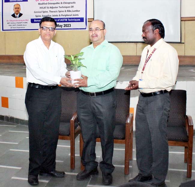 डॉ0 दिब्येन्दु नारायण बिद ने अपनी पीएचडी आरके विश्वविद्यालय, राजकोट से की है। वे एक प्रमाणित ऑकिस्टयोपैथ और कायरोप्रैक्टिषनर है। उनके पास 26 साल का क्लीनिकल और टीचिंग का अनुभव है। डॉ दिबयेन्दुरारायण ने रीढ़ और विभिन्न परिधीय जोडों के मैनिपुलेशन का प्रदर्शन किया जो लम्बे समय से चल रहे दर्द से राहत दिलाने में मदद करता है। मैनिपुलेशन थेरेपी सीखने के दौरान छात्रों को बिल्कुल अलग अनुभव हुआ और उन्होंने प्रत्येक तकनीक का बडे उत्साह और ईमानदारी के साथ अभ्यास किया। कार्यशाला के दौरान छात्रों ने मैनिपुलेशन थेरेपी के बारे में कई प्रश्र रखे जिन्हें डॉ दिबयेन्दुनारायण बिद ने प्रभावी ढंग से दूर किया।