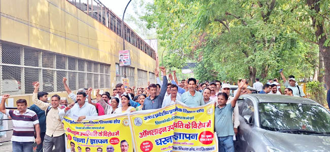 गाजियाबाद। परिषदीय स्कूलों में शिक्षकों का ऑनलाइन उपस्थिति का विरोध लगातार जारी है। ऑनलाइन उपस्थिति के विरोध में गुरुवार को उत्तर प्रदेशीय प्राथमिक शिक्षक संघ के नेतृत्व में सैकड़ों ने शिक्षक-शिक्षिकाओं ने कलेक्ट्रेट पर प्रदर्शन करते हुए जिलाधिकारी के माध्यम से मुख्यमंत्री के नाम ज्ञापन सौंपा। संघ के प्रांतीय उपाध्यक्ष डॉ. अनुज त्यागी ने बताया कि बेसिक शिक्षा परिषद के नियंत्रणाधीन शिक्षक शिक्षिकाओं की पूर्व से लंबित विभिन्न समस्याओं एवं मांगों के संबंध में संगठन द्वारा अनेकों अनेक पत्र शासन व विभाग में विभाग अधिकारियों को उचित माध्यम से प्रेषित किए गए परंतु आज तक किसी भी समस्या का निस्तारण नहीं किया गया बल्कि शासन द्वारा बेसिक शिक्षा परिषद के शिक्षक शिक्षिकाओं से विद्यालय पंजिकाओं का डिजिटाइजेशन व डिजिटल ऑनलाइन से छायांकन उपस्थिति कराए जाने जैसे निर्देश जारी कर दिए गए जो कि पूर्णतया अव्यवहारिक है। सर्वोच्च न्यायालय द्वारा भी ऐसा किया जाना व्यक्ति की निजता का हनन माना गया है। जबकि सचिवालय कर्मचारी, राज्य कर्मचारी, माध्यमिक शिक्षा, उच्च शिक्षा सहित अन्य विभागों में उपस्थिति की अन्य प्रणाली लागू की गई है। ऐसे में परिषदीय शिक्षकों के साथ दोहरा मापदंड अपनाया जा रहा है जो कि न्यायोचित नहीं है।