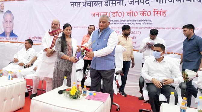 गाजियाबाद। चुनौतियों के साथ अगर कोई काम करना चाहे तो एक अच्छे स्तर का काम हो सकता है। हमें आगे आने वाले समय में कुछ नया करके दिखाना है ताकि डासना की जनता को यह एहसास हो कि कुछ नया हमारे लिए किया जा रहा है। यह बातें शुक्रवार को केंद्रीय राज्यमंत्री रिटायर्ड जनरल वीके सिंह ने डासना नगर पंचायत में कुल चार करोड़ रुपए की लागत से बनी परियोजनाओं लोकार्पण करते हुए कहीं। उन्होंने कहा कूड़े का निस्तारण, गलियों की सफाई, नालियों की सफाई जैसे जरूरी कार्यों का समय-समय पर होना अति आवश्यक है। उन्होंने डासना क्षेत्र अंतर्गत आमजन का आह्वान करते हुए कहा कि डासना क्षेत्र के अंदर जो भी सड़कें टूटी हुई या गड्ढे है ऐसी सड़को के बारे में जरूर बताएं ताकि उन्हें सही कराया जा सके और अगर आपको कोई परेशानी होती है उसको जिला मुख्यालय तक जरूर पहुंचाएं ताकि उसका निस्तारण कराया जा सके और अगर कार्य में किसी तरह की कोताही बरती जा रही है, गुणवत्ता से समझौता किया जा रहा है, उसके बारे में अवश्य बताएं क्योंकि हम गुणवत्ता से समझौता नहीं कर सकते।