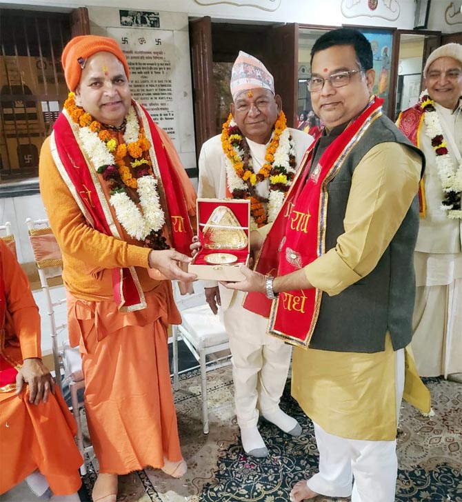 नई दिल्ली। गोल मार्किट गीता भवन बिरला मंदिर परिसर में गीता जयंती पर दिल्ली में सात्विकम वेलफेयर फाउंडेशन द्वारा व्याख्यान सत्संग का आयोजन किया गया। अखिल भारतीय ब्राह्मण महासभा के राष्ट्रीय महामंत्री तरुण मिश्रा ने सात्विकम वेलफेयर फाउंडेशन के अंतरराष्ट्रीय योगा महोत्सव में इस्कॉन मंदिर अमेरिका से जुड़े स्वामी वास आचार्य को वास्को फाउंडेशन की ओर से गीता जयंती पर बधाई देते हुए स्मृति चिन्ह भेंट किया। स्वामी वास आचार्य ने राष्ट्रीय महामंत्री तरुण मिश्रा को पटका पहनाकर उनका स्वागत किया।