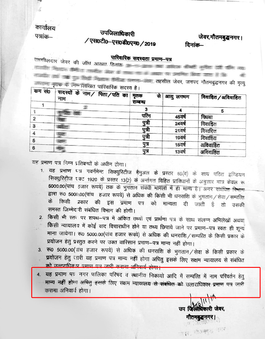 प्राधिकरण किसानों की भूमि खरीद रहा है। भूमि के बदले किसानों को पैसा दिया जाता है। अगर किसी परिवार के मुखिया की मौत हो गई। उसके बाद उसे परिवार प्रमाण पत्र की जरूरत पड़ती है। इस प्रमाण पत्र में जिला प्रशासन द्वारा दजज़् किए गए एक और बिंदु से परेशानी बढ़ गई है। इसमें लिखा है कि यह प्रमाण पत्र इसके लिए मान्य नहीं होगा। उसे सक्षम न्यायालय से जारी कराना होगा। इसके चलते प्राधिकरण भी पैसा देने में आनाकानी करते हैं।