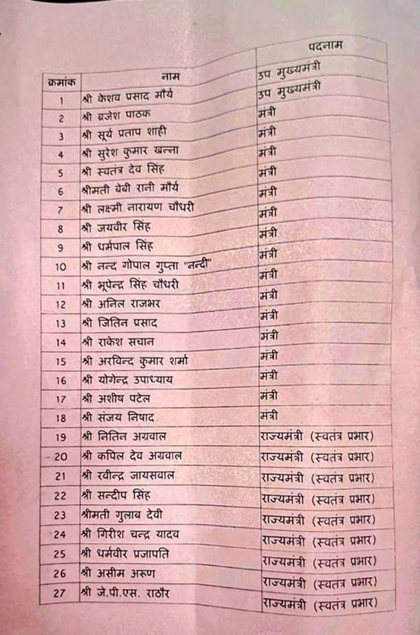 योगी सरकार में सूर्य प्रताप शाही, सुरेश कुमार खन्ना, स्वतंत्र देव सिंह, बेबी रानी मौर्य, लक्ष्मी नारायण चौधरी, जयवीर सिंह, धर्मपाल सिंह, नंद गोपाल गुप्ता नंदी, भूपेंद्र सिंह चौधरी, अनिल राजभर, जितिन प्रसाद, राकेश सचान, अरविंद कुमार शर्मा, योगेंद्र उपाध्याय, आशीष पटेल, संजय निषाद कैबिनेट मंत्री बनाए गए हैं।
