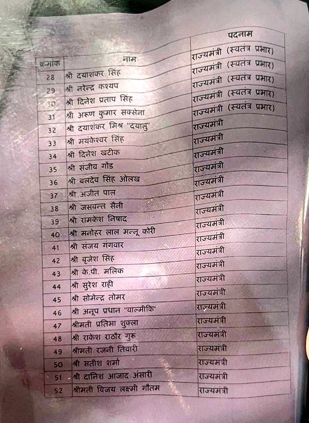 राज्य मंत्री (स्वतंत्र प्रभार)-नितिन अग्रवाल, कपिलदेव अग्रवाल, रवीन्द्र जायसवाल, संदीप सिंह, गुलाब देवी, गिरीश चंद्र यादव, धर्मवीर प्रजापति, असीम अरुण, जेपीएस राठौर, दयाशंकर सिंह, नरेंद्र कश्यप, दिनेश प्रताप सिंह, अरुण कुमार सक्सेना, दयाशंकर मिश्र दयालु।